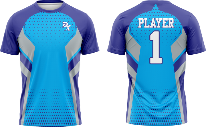 Blue sports jersey with gray accents and 'PLAYER' text on a white background